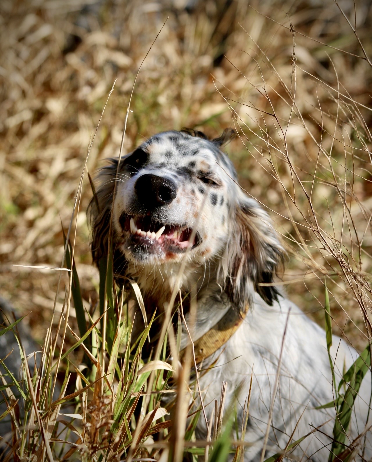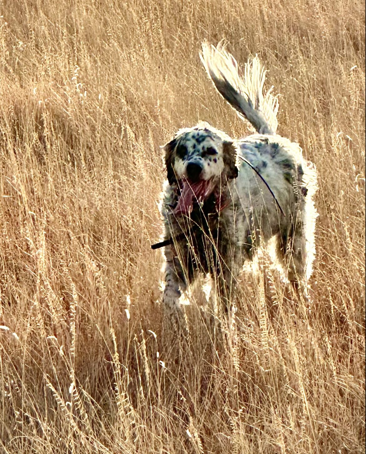 As our first setter, I was unsure of the training required to make her a bird dog. When spring arrived we got a dozen quail for an introduction to flushing birds and gunfire. This was the one and only training session she ever had. It was clear that if she scented bird, she wouldn’t budge. When fall arrived she joined our pack and chased nothing but wild birds from then on.